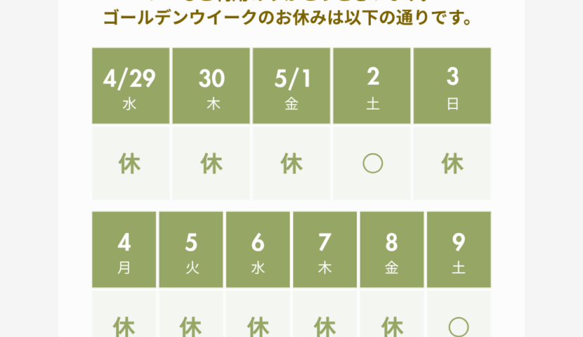 誠に勝手ながら、4/29(水)~5/1(金)、5/3(日)~5/8(金)を休診させていただきます。